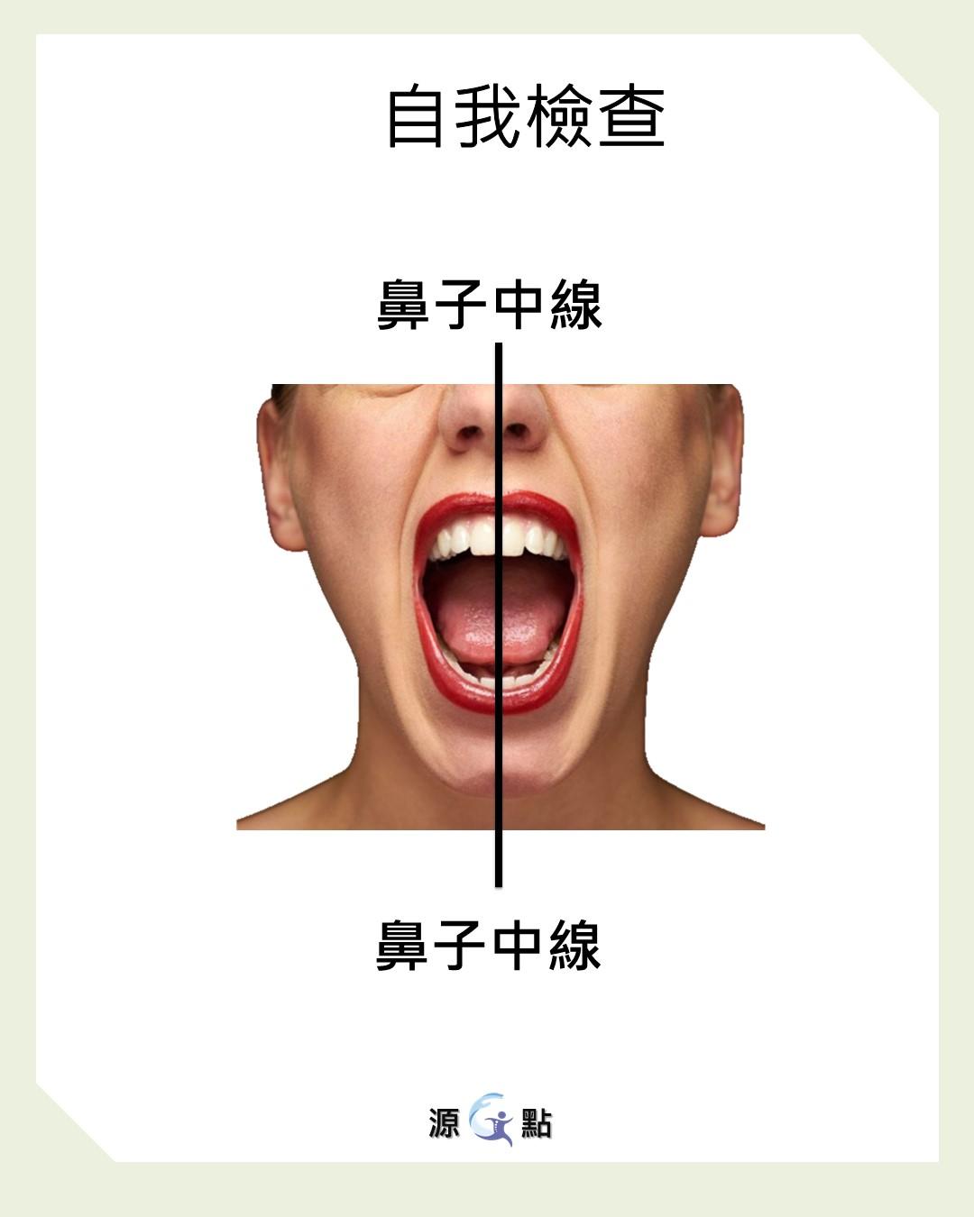 在嘴巴張開時,注意鼻子中點與下巴中點,兩點連線是否為直線